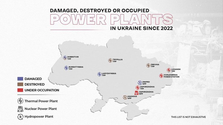 Офіційні дані вказують на те, що країна втратила більше половини своїх потужностей з виробництва електроенергії через пошкоджену, зруйновану або примусово захоплену Росією інфраструктуру. Реальність, імовірно, гірша, оскільки, як передбачається, в України залишилася лише п'ята частина загальної встановленої потужності.