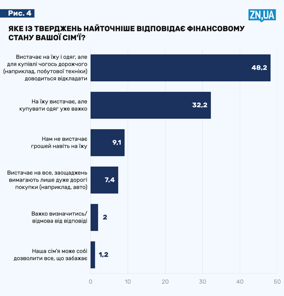 Більше ніж 32% українців відповіли, що їм на харчі вистачає, але одяг купувати важко. 9% не вистачає грошей навіть на їжу. І лише трохи більше 1% вказали, що сім'я може собі дозволити все, чого забажає.