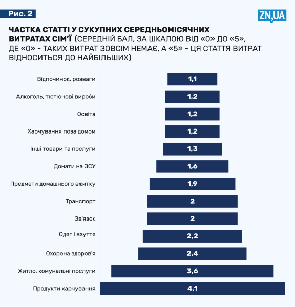 Так, левову частку доходів українці витрачають на продукти харчування (4,1 бала), не забувають про ЖКП (3,6 бала), здоров'я (2,4 бала), ледь можуть собі дозволити купувати новий одяг і взуття (2,2 бала).