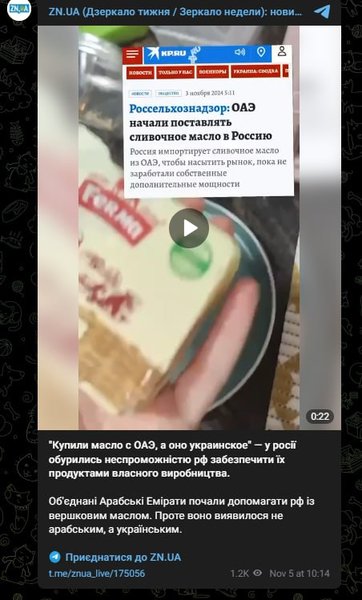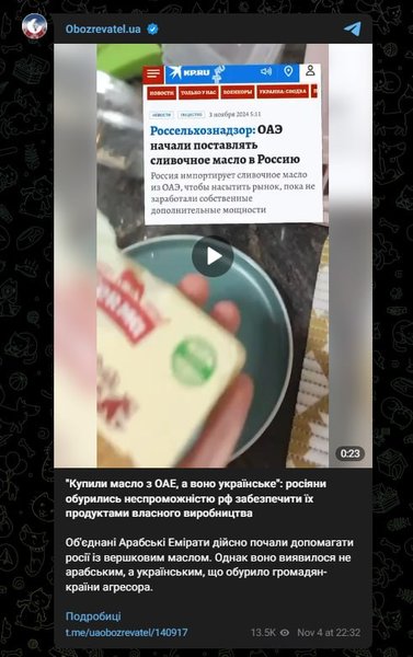 Тelegram-канал "Труха Україна" також стверджує, що відео про українське масло було знято не в Росії, а в ОАЕ.