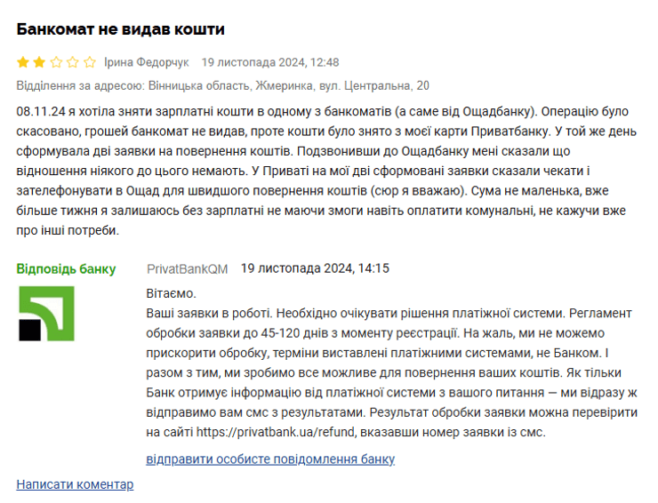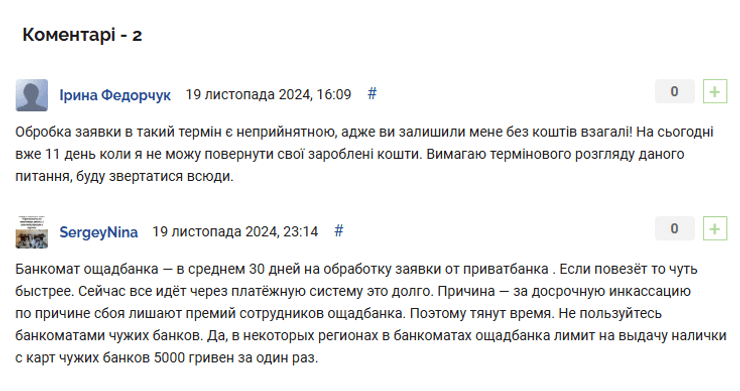 У коментарях ще один клієнт заявив, що в середньому така заявка у випадку з банкоматами "Ощадбанку" займає 30 днів.