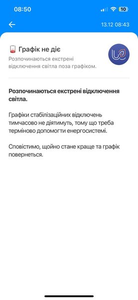 Тим часом мобільний застосунок для жителів столиці "Київ Цифровий" надіслав на смартфони киян повідомлення, що графік наразі не діє, оскільки розпочинаються екстрені відключення світла.