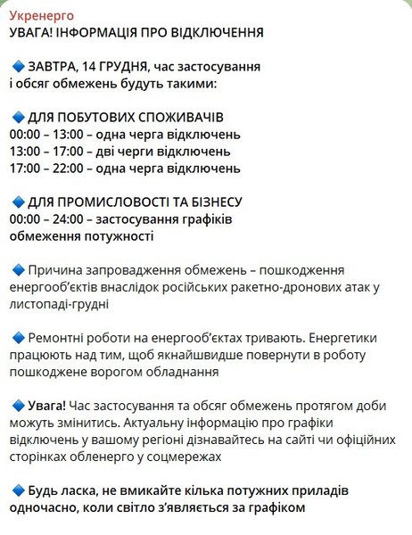 У дописі "Укренерго", який з'явився о 17:18 13 грудня, повідомили про зміну графіків відключень через 12-й ракетно-дроновий удар ЗС РФ, який стався вночі. Енергетики змістили періоди, коли починаються діяти стабілізаційні обмеження. Ще напередодні вони діяли лише вдень, з 6 до 21 год, але 14 грудня — діятимуть протягом доби, і навіть вночі.