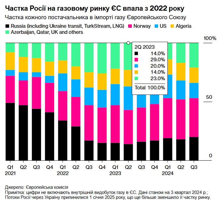 У статті навели інфографіку постачання газу у Європу. На діаграмі видно, що у першому кварталі 2022 року росіяни покривали більш як третину потреб. Найнижчий рівень зафіксували у другому кварталі 2023 року — 14%. Після цього надходження російського блакитного палива зростало і у третьому кварталі 2024 року досягнуло 20%.
