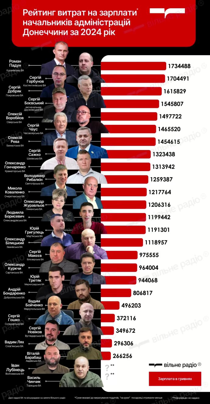 Згідно з наданими Вільному радіо даними, на Донеччині є очільники міст і громад, які у 2024 році заробили вдвічі та втричі менше за колег. Найменші зарплати отримали:
