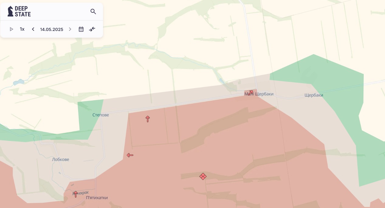 Згідно з даними проєкту DeepState, село Малі Щербаки перебуває у сірій зоні. Відстань від лінії бойового зіткнення до перехрестя автодоріг "Т 0812" та "М-18/ — Приморське — Степногірськ — Малі Щербаки", розташованого на вулиці Першотравневій у центрі населеного пункту, становить орієнтовно 29 метрів.