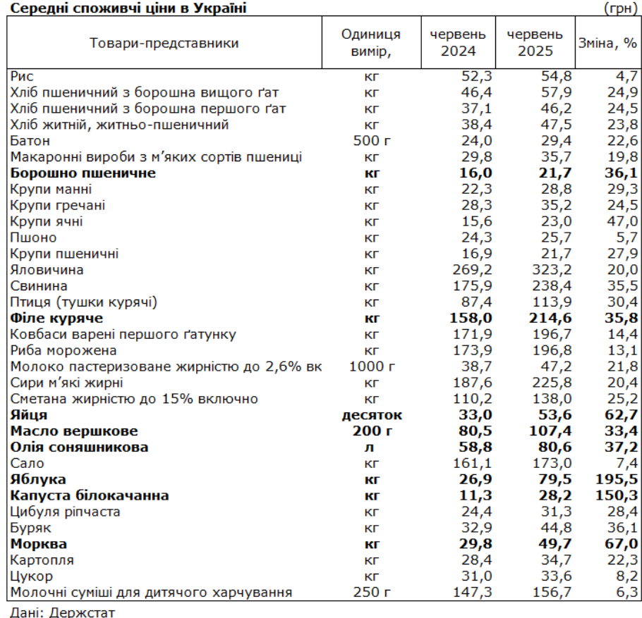 Згідно з даними статистичного відомства, за рік яблука подорожчали майже втричі — на 195,5%, досягнувши 79,5 гривень за кілограм. Капуста зросла в ціні в 2,5 раза — до 28,2 гривень за кілограм, а морква подорожчала на 67,0%, до 49,7 гривень за кілограм.