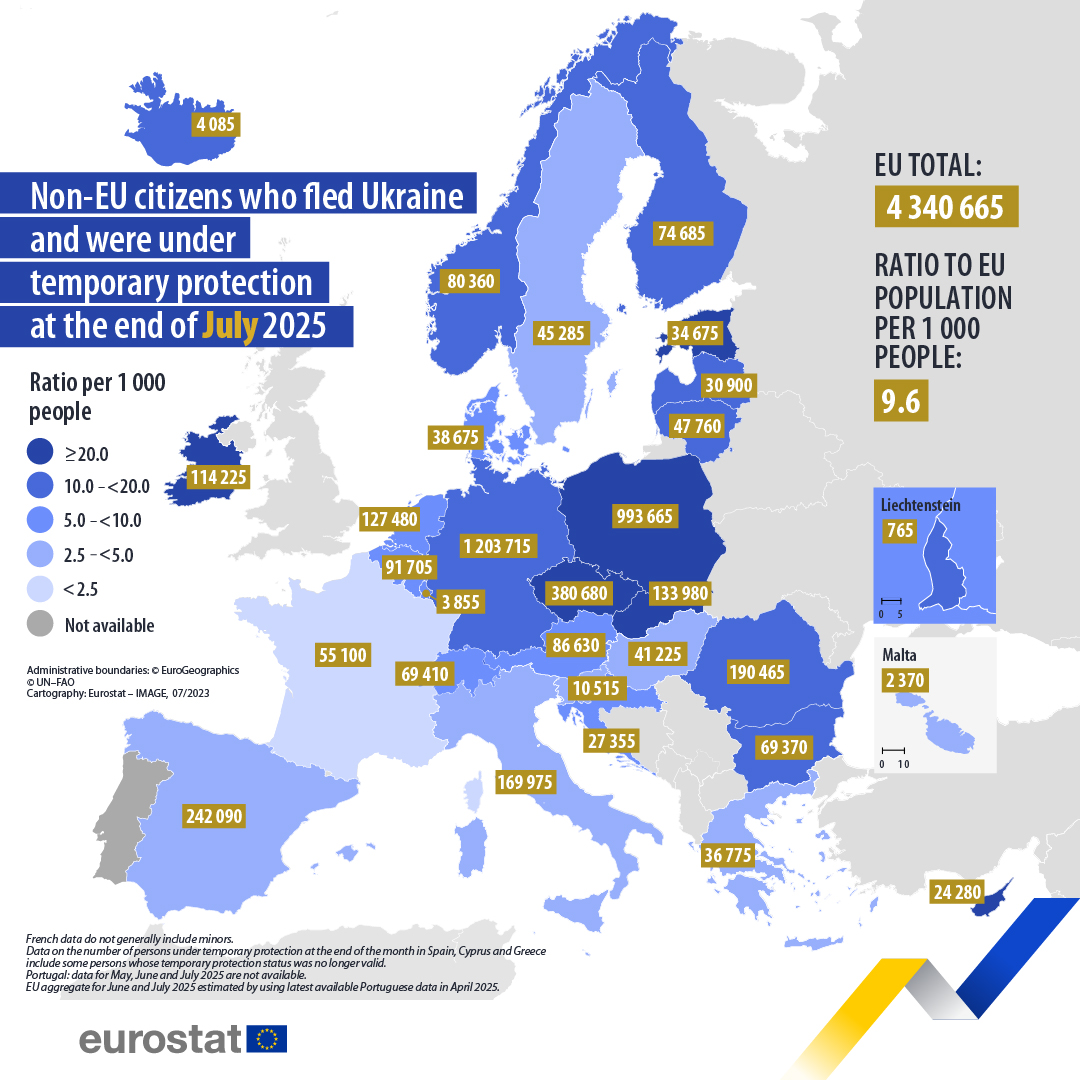 Порівнюючи з кінцем червня 2025 року, загальна кількість осіб із тимчасовим захистом у ЄС збільшилася на 28 695 осіб, або 0,7%, і досягла 4 340 665. Зростання зафіксовано у 24 країнах ЄС. Найбільший абсолютний приріст спостерігався в Німеччині (+7 070 осіб), Румунії (+2 300) і Чехії (+2 260).