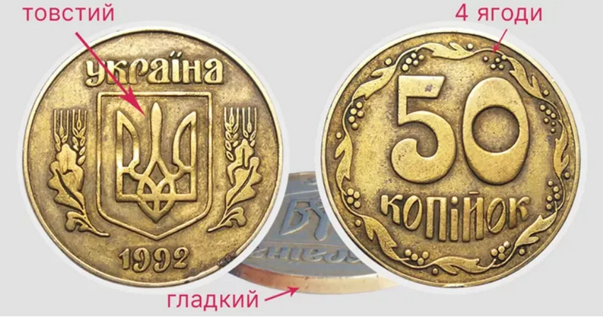 Наприклад, на особливу увагу заслуговує монета номіналом 50 копійок 1992 року різновиду 3ВАг. Її ціна коливається від 4 000 до 11 000 гривень.