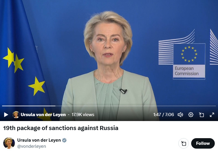 Президентка Європейської комісії Урсула фон дер Ляєн представила пропозиції до 19-го пакету санкцій проти Росії. Нові обмеження спрямовані на енергетичний сектор, фінансові інструменти та компанії, що допомагають Кремлю обходити санкції.