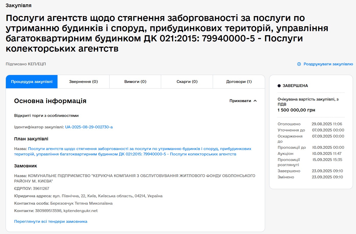 Згідно з даними із системи Prozorro, договір про надання колекторських послуг було підписано 22 вересня 2025 року, але вже наступного дня в документи внесли зміни.
