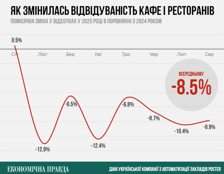 Аналітика компанії з автоматизації закладів Poster свідчить, що з січня по серпень 2025 року заклади в Україні відвідали на 8,5% менше гостей, ніж за аналогічні місяці попереднього року.