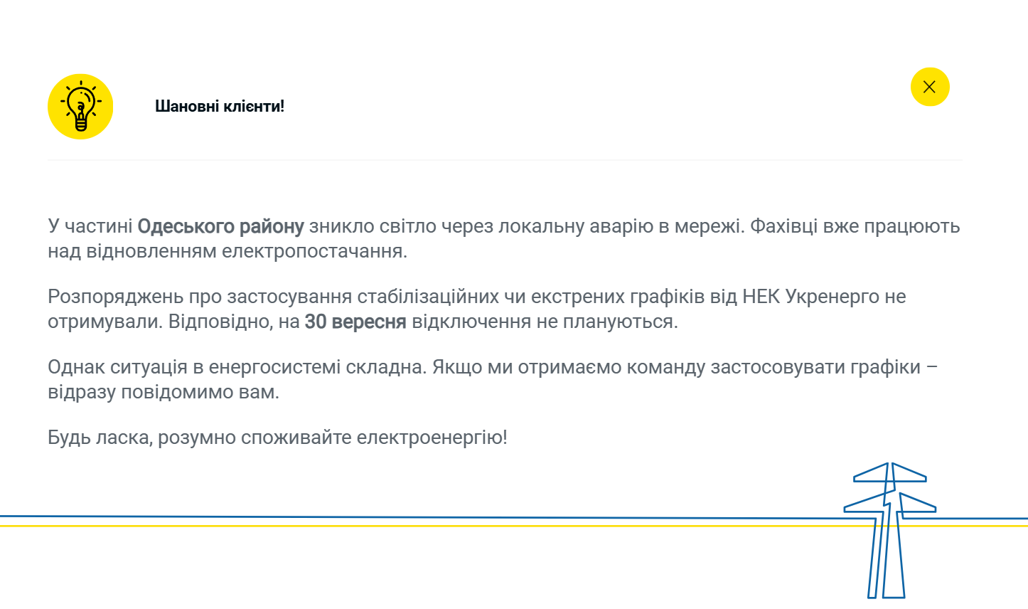 Оголошення про аварійне відключення світла в частині Одеського району опубліковане на сайті ДТЕК. В компанії повідомляють, що фахівці працюють над ліквідацією локальної аварії та відновленням електропостачання.