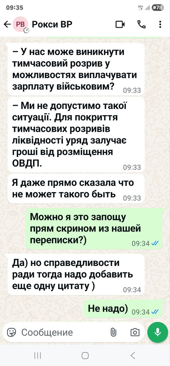 Також народний депутат Максим Бужанський оприлюднив листування з Підласою. Він підкреслив, що вона спростувала чутки про можливі затримки з виплатами зарплат українським військовим.