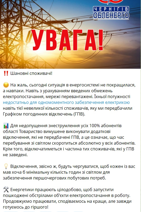 "Для недопущення знеструмлення всіх 100% абонентів області Товариство вимушене виконувати додаткові відключення, не передбачені ГПО, а це означає, що час перебування зі світлом скоротиться абсолютно в усіх абонентів", — ідеться в повідомленні енергетиків.
