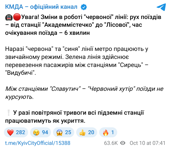 На "зеленій" лінії поїзди курсують між станціями "Сирець" і "Видубичі". Між станціями "Славутич" — "Червоний хутір" рух поїздів станом на 7:41 не відновлено.