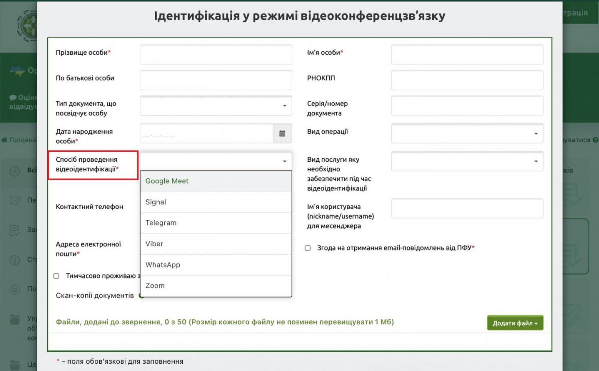- обрати зі списку спосіб проведення відеоідентифікації (Google Meet, Signal, Telegram, Viber, WhatsApp, Zoom).