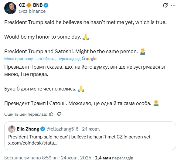 Пізніше CZ написав у соціальній мережі X (раніше Twitter), що Трамп згадав, що не зустрічався з ним особисто і додав: "Коли-небудь я вважатиму це за честь. Президент Трамп і Сатоші. Можливо, це одна й та сама людина".