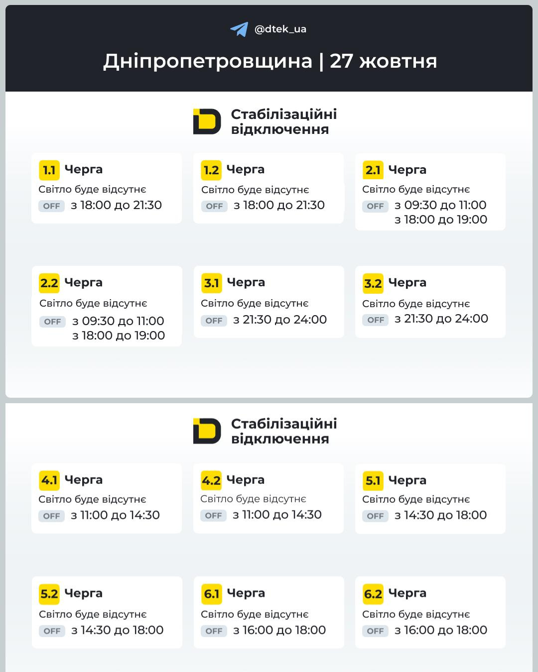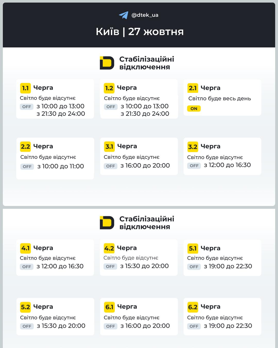 27 жовтня у Києві й низці регіонів застосували екстрені відключення, а згодом оголосили про перехід до стабілізаційних графіків. У ДТЕК заявили, що для столиці і Дніпропетровської області оновили графіки відключень.