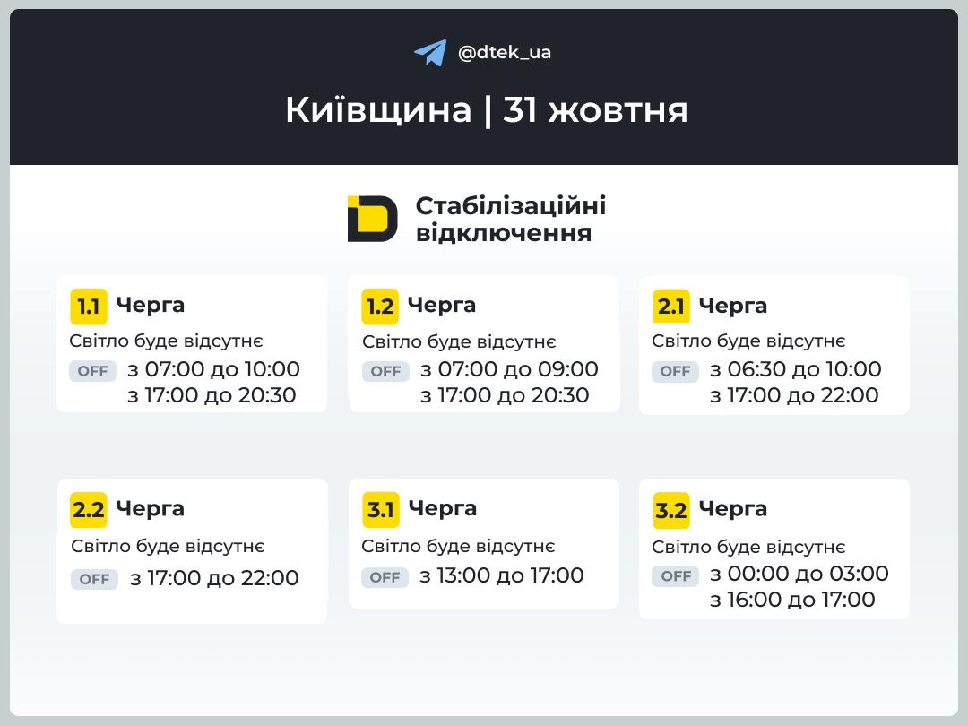За інформацією ДТЕК та "Укренерго", обмеження запроваджуються по всій країні у зв’язку з дефіцитом потужності та необхідністю балансування енергосистеми. 31 жовтня графіки погодинних відключень можуть охоплювати від 0,5 до 3 черг на добу, залежно від регіону та навантаження. Найбільше навантаження на мережу очікується у вечірній час — з 16:00 до 18:00. Для промислових підприємств обмеження будуть діяти безперервно протягом доби — з 00:00 до 24:00.