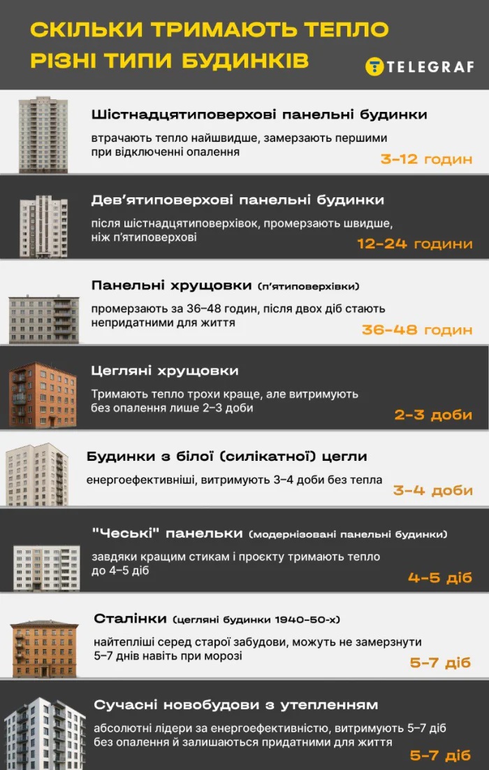 Деякі типи будинків промерзають за добу, а є такі, що здатні витримати тиждень без опалення. Але панельні "хрущовки", яких повно в українських містах, промерзають за 36 годин.