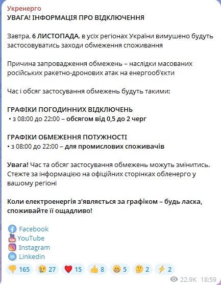 Укренерго запровадило графіки відключень в усіх регіонах на 6 листопада
