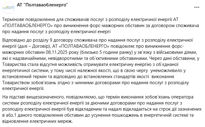 Унаслідок обстрілу о 5-й годині ранку минулої суботи АТ "Полтаваобленерго" зіткнулося з форс-мажорними обставинами, які є "надзвичайними, невідворотними та об'єктивними", повідомили в компанії.