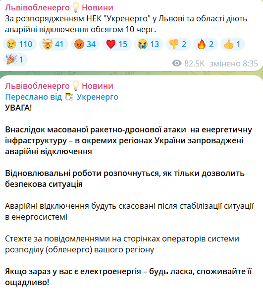 Унаслідок обстрілів уночі та вранці 19 листопада в деяких областях пошкоджено обладнання та знеструмлено споживачів. О 08:35 ранку енергетики повідомили про те, що за розпорядженням НЕК "Укренерго" у Львові та області діють аварійні відключення в обсязі 10 черг.