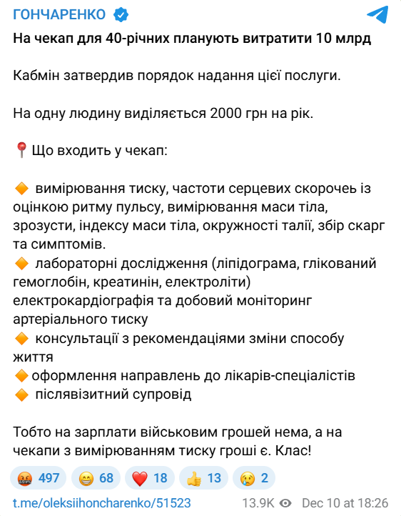 Нардеп Олексій Гончаренко повідомив, що Кабінет міністрів України затвердив порядок надання послуги безкоштовних чекапів для українців віком від 40 років. На програму планують витратити 10 млрд грн.