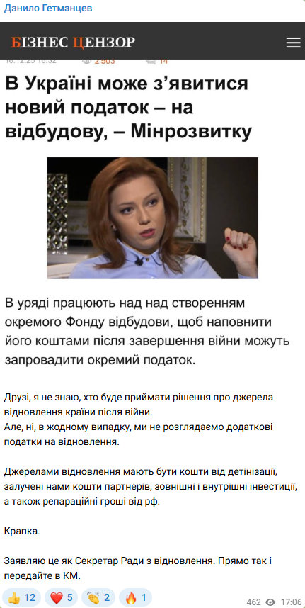 Гетманце спростував анонс податку на відбудову від Мінрозвитку