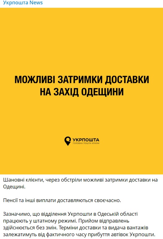 "Зазначимо, що відділення Укрпошти в Одеській області працюють у штатному режимі. Приймання відправлень здійснюється без змін. Терміни доставки та видача вантажів залежатимуть від фактичного часу прибуття автомобілів Укрпошти", — підкреслили в компанії.