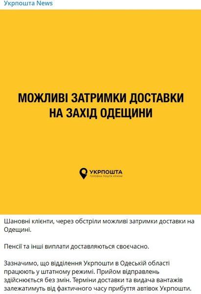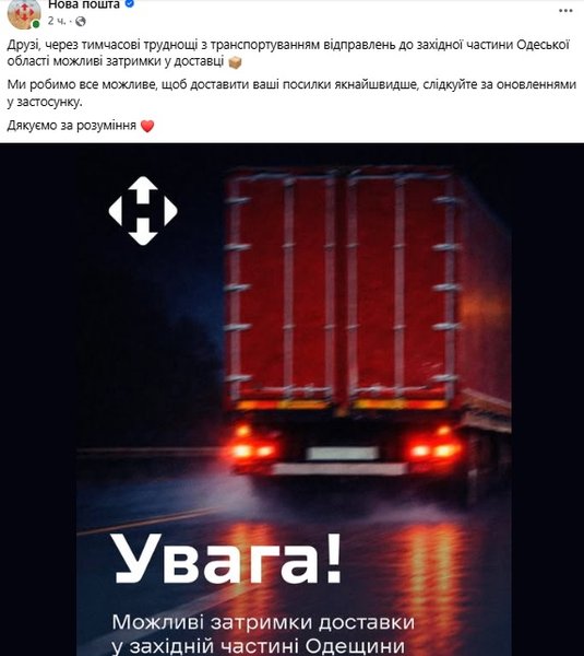 "Друзі, через тимчасові труднощі з транспортуванням відправлень у західну частину Одеської області можливі затримки в доставці. Ми робимо все можливе, щоб доставити ваші посилки якнайшвидше, слідкуйте за оновленнями в додатку. Дякуємо за розуміння", — йдеться в заяві поштового оператора.