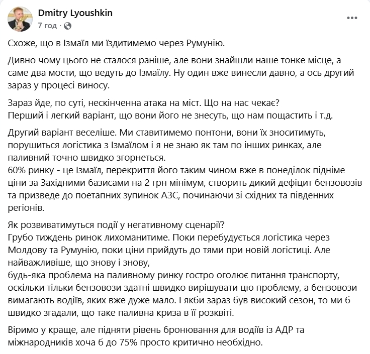 "60% ринку — це Ізмаїл, перекриття його таким чином вже в понеділок підніме ціни за Західними базисами на 2 грн мінімум, створить дикий дефіцит бензовозів та призведе до поетапних зупинок АЗС, починаючи зі східних та південних регіонів", — написав Левушкін.