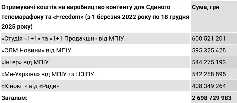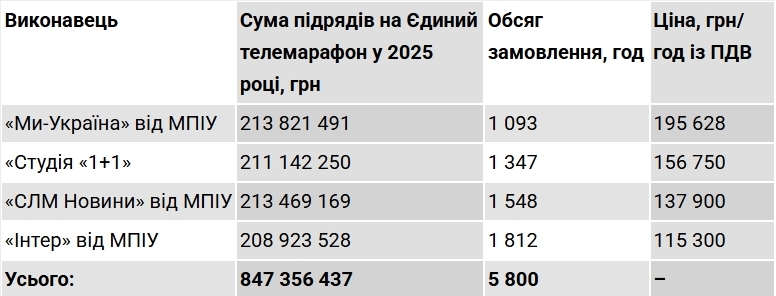 ДП "Мультимедійна платформа іномовлення України" 16 грудня уклало чотири угоди з телеканалами на створення контенту для марафону "Єдині новини #UAразом" до кінця 2025 року на загальну суму 109 млн гривень.