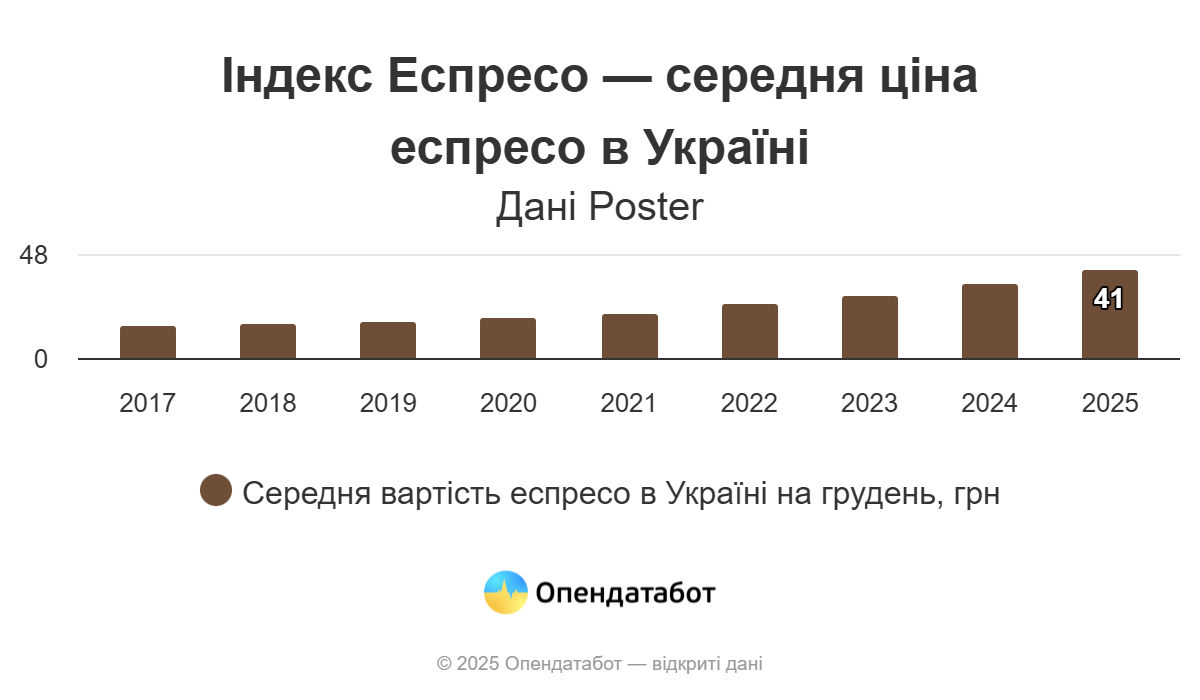 Аналіз ціни на каву в Україні в грудні опублікував 29 грудня Опендатабот. Спільно з українською компанією з автоматизації ресторанів Poster платформа середню вартість чашки напою в різних регіонах і представив "Індекс Еспресо України 2025".