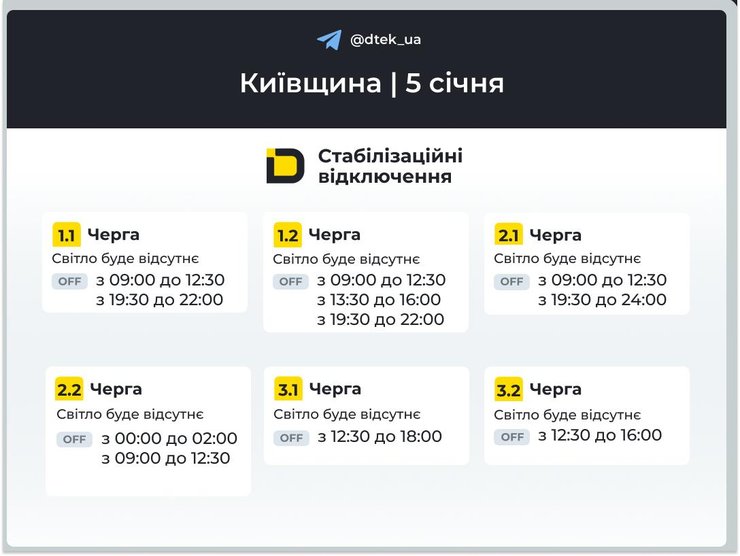 Графіки вимкнення світла для Київської області на 5 січня