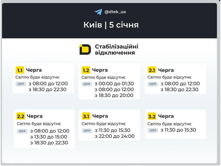 Графіки вимкнення світла для Києва на 5 січня