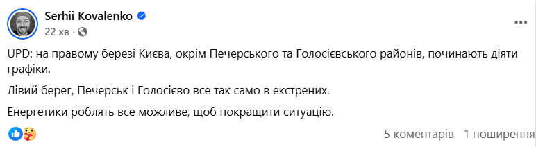 Генеральний директор YASNO Сергій Коваленко станом на 18:07 повідомляв, що на правому березі столиці, за виключенням Печерського та Голосіївського районів, повернулися графіки стабілізаційних відключень.