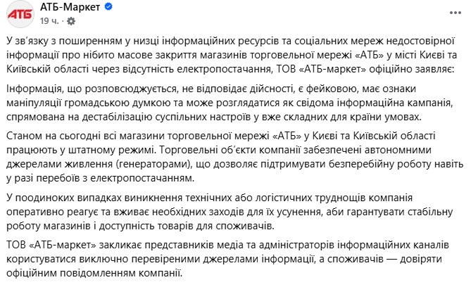 "На сьогоднішній день всі магазини торговельної мережі "АТБ" у Києві та Київській області працюють у штатному режимі. Торгові об'єкти компанії забезпечені автономними джерелами живлення (генераторами), що дає змогу підтримувати безперебійну роботу навіть у разі перебоїв з електропостачанням. У рідкісних випадках виникнення технічних або логістичних труднощів компанія оперативно реагує і вживає необхідних заходів для їх усунення, щоб гарантувати стабільну роботу магазинів і доступність товарів для споживачів", — йшлося в повідомленні.