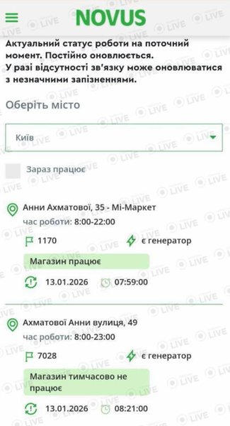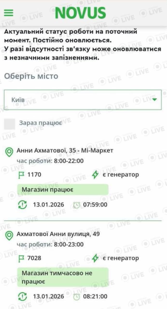 Наприклад, у Novus заявили, що не всі магазини можуть працювати як зазвичай. Станом на ранок 13 січня не працювали приблизно 17 супермаркетів у Києві та області.