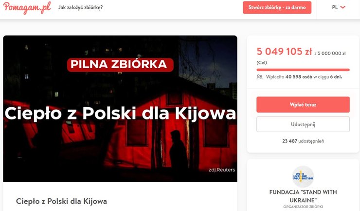 Гроші на тепло для Києва пожертвували вже понад 40,5 тисяч небайдужих поляків.