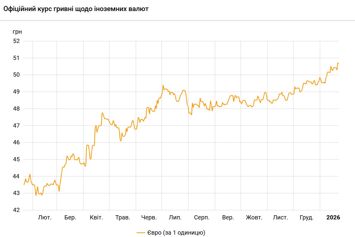 На четвер, 22 січня, регулятор встановив курс євро на позначці 50,66 грн, що на 6 копійок менше, ніж днем раніше.