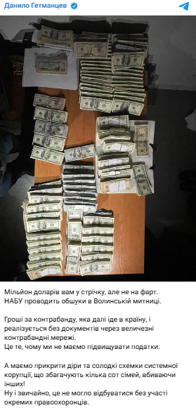 Уранці про обшуки на Волинській митниці писав нардеп Данило Гетманцев, який очолює Комітет з питань фінансів, податкової та митної політики. Він стверджував, що детективи виявили мільйон доларів.