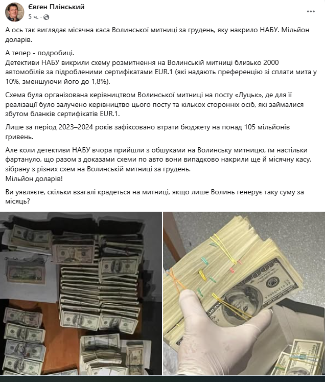 Напередодні журналіст Євген Плінський стверджував, що мільйон доларів — це "каса" Волинської митниці за грудень. У своєму дописі на Facebook він розповів, що детективи НАБУ викрили схему розмитнення на Волинській митниці близько 2000 автомобілів за підробленими сертифікатами EUR.1 (які надають преференцію зі сплати мита в 10%, зменшуючи його до 1,8%).
