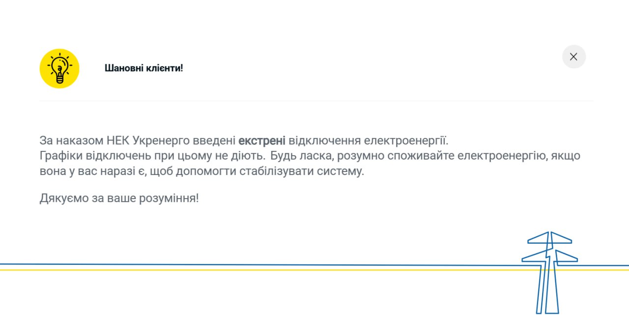 "Одеса, частково Одеський район і деякі районні центри Одещини — тривають екстрені відключення", - сказано у повідомленні.