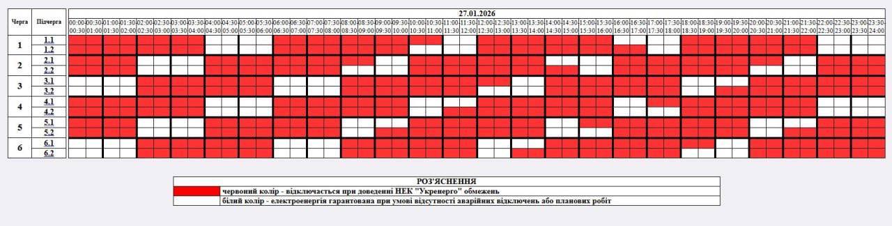 По всій Україні 27 січня запроваджуються графіки погодинних відключень та графіки обмеження потужності для промислових споживачів через наслідки попередніх російських ударів дронами та ракетами по енергооб'єктах. У ДТЕК оприлюднили графіки для Дніпропетровської та Київської областей.