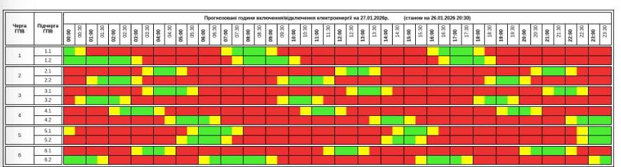 У вівторок, 27 січня, у споживачів деяких груп не буде світла понад 18 годин. Електроенергію вимикатимуть у всіх регіонах по кілька разів на добу.
