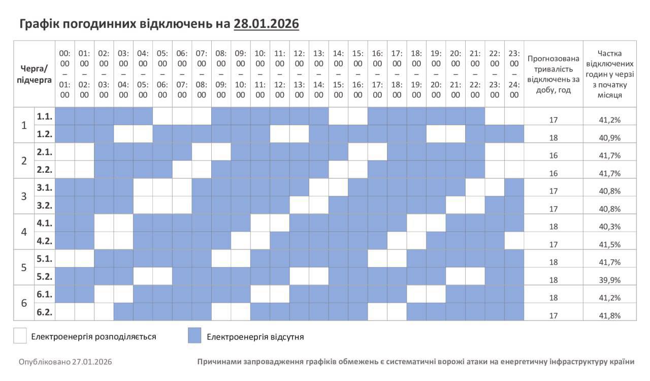 У середу, 28 січня, у деяких регіонах споживачі не матимуть світла понад 18 годин. Електроенергію вимикатимуть у всіх областях по кілька разів на добу