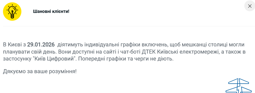 У ДТЕК не публікували графіки відключень світла для Київської області на сьогодні. Однак енергетики повідомили, що у столиці від опівночі 29 січня будуть діяти тимчасові графіки відключень.