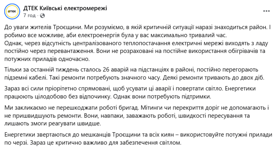 Також у ДТЕК закликали мешканців Троєщини та інших киян, аби ті використовували потужні прилади по черзі. Саме цей чинник є критичним для того, щоб забезпечити домівки світлом.